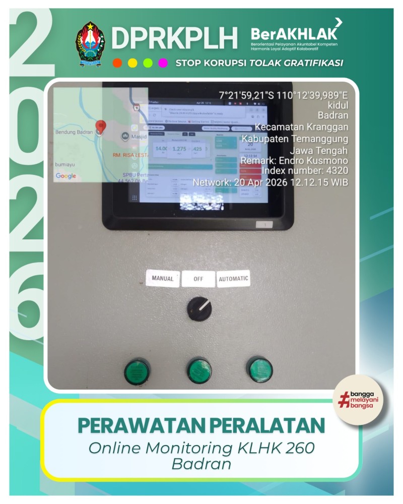 Berita Kategori: Smart Government (Pemerintah Cerdas) Bidang Pengendalian Pencemaran dan Kerusakan Lingkungan Hidup Senin, 20/04/2026 14:33 0 Gayam: Pohon Sahabat Air Penjaga Kelestarian Alam Selengkapnya Kategori: Smart Government (Pemerintah Cerdas) Bidang Pengendalian Pencemaran dan Kerusakan Lingkungan Hidup Senin, 20/04/2026 14:31 0 perawatan peralatan pemantauan kualitas air pada Pos Stasiun Online Monitoring KLHK 260 Badran, Kecamatan Kranggan Selengkapnya Kategori: Smart Government (Pemerintah Cerdas) Bidang Pengendalian Pencemaran dan Kerusakan Lingkungan Hidup Senin, 20/04/2026 14:26 0 DPRKPLH Temanggung Menerima Permohonan Bibit dari Gerakan Pemuda (GP) Ansor Selengkapnya Kategori: Smart Government (Pemerintah Cerdas) Sekretariat Senin, 20/04/2026 13:39 0 Rapat Evaluasi Capaian Kinerja Triwulan I DPPRKPLH Kab. Temanggung Selengkapnya Kategori: Smart Government (Pemerintah Cerdas) Bidang Pengendalian Pencemaran dan Kerusakan Lingkungan Hidup Senin, 20/04/2026 13:36 0 Apel Luar Biasa Dalam Rangka Mutasi Pegawai DPRKPLH Kab. Temanggung Selengkapnya Kategori: Smart Government (Pemerintah Cerdas) Sekretariat Jumat, 17/04/2026 14:43 0 Selamat dan Sukses kepada TATIK NUR AZIZAH, S.A.P., atas amanah baru sebagai "Kepala Sub-Bagian Perencanaan dan Keuangan DINKOPDAG Kabupaten Temanggung Selengkapnya Kategori: Smart Government (Pemerintah Cerdas) Sekretariat Jumat, 17/04/2026 14:42 0 Selamat dan Sukses atas dilantiknya OKTO ISBUDIWANTO, S.Sos., sebagai "Kepala Sub-Bagian Tata Usaha TPA-IPLT DPRKPLH Kabupaten Temanggung Selengkapnya Kategori: Smart Government (Pemerintah Cerdas) Bidang Perumahan Rakyat dan Kawasan Permukiman Jumat, 17/04/2026 14:40 1 Kick-Off BSPS 2026: Koordinasi Awal Bidang Perkim dan Tim Fasilitator DPRKPLH Kab. Temanggung Selengkapnya Kategori: Smart Government (Pemerintah Cerdas) Bidang Perumahan Rakyat dan Kawasan Permukiman Jumat, 17/04/2026 14:37 0 Koordianasi Internal Bidang Perumahan dan Kawasan Permukiman DPRKPLH Temanggung Selengkapnya Kategori: Smart Government (Pemerintah Cerdas) Bidang Kebersihan dan Pengelolaan Persampahan Jumat, 17/04/2026 14:34 0 Rapat Koordinasi Pemeliharaan Kendaraan Armada Sampah Selengkapnya Kategori: Smart Government (Pemerintah Cerdas) UPT Jumat, 17/04/2026 14:33 0 Pemeliharaan Rusunawa Kertosari Oleh Petugas Demi Kenyamanan Selengkapnya Kategori: Smart Government (Pemerintah Cerdas) UPT Jumat, 17/04/2026 14:30 0 Persiapan Audit Kearsipan UPT Rusunawa DPRKPLH Temanggung Selengkapnya FirstPrev45678NextLast